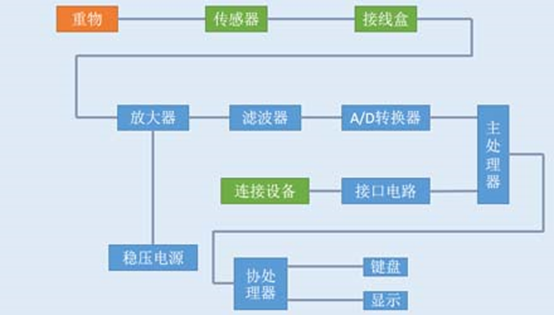 電子稱重系統(tǒng)一般由秤體、稱重傳感器、接線盒、稱重顯示儀表等部分組成,其工作原理如下圖所示,首先多只稱重傳感器將感應重物所獲取的重量信號經(jīng)接線盒匯總后進入儀表(若稱重系統(tǒng)中一個秤體只有一只傳感器則不需要接線盒進行信號匯總),儀表將微弱的重量信號(mV級)經(jīng)放大、濾波及A/D轉(zhuǎn)換,然后通過數(shù)字處理,將稱重信號顯示到數(shù)字屏幕上;此外,對于需要將信號接入PLC、觸摸屏、計算機、打印機等設備的系統(tǒng),稱重儀表還會通過接口電路輸出不同的信號,將重量數(shù)據(jù)及控制信號輸送至其他系統(tǒng)設備中去;為了滿足儀表的通用性及便利性,稱重儀表中一般還會加入設定/校正功能、置零去皮功能、零點跟蹤功能、預置點輸出功能等。