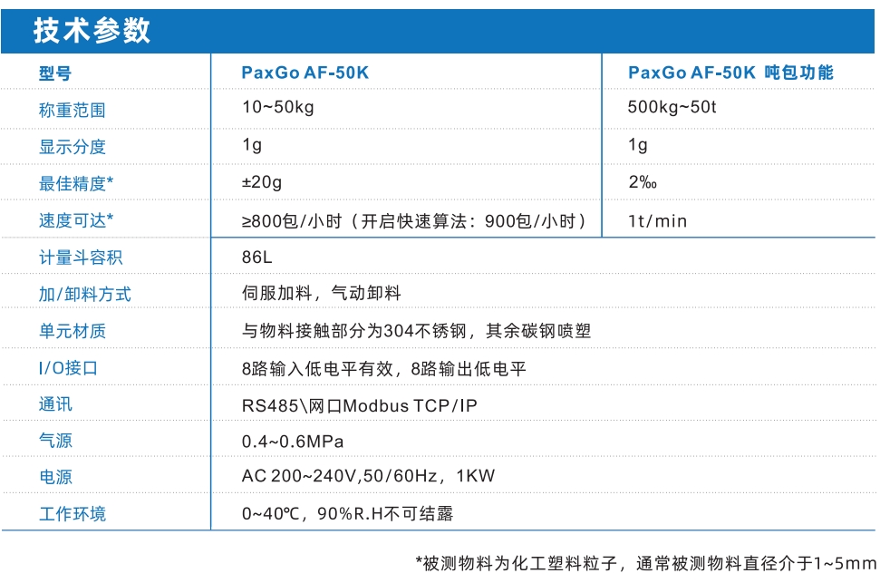 ● 顆粒物料:針對(duì)大袋定量包裝設(shè)備,適用于塑料粒子、大米、糖等流動(dòng)性好的顆粒型物料;