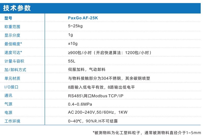 PaxGo系列—AF-25K通用版包裝秤單元是一款智能定量稱重包裝秤頭,它的自適應參數(shù)調(diào)節(jié)功能可以精準控制包裝物料的流量,實現(xiàn)精準高速包裝,無需人工調(diào)節(jié)參數(shù),廣泛應用于化工、糧食等行業(yè)的顆粒物料定量包裝設備。
