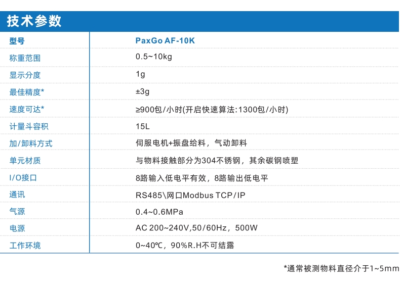 PaxGo系列-AF-10K自動(dòng)定量包裝秤是一款顆粒包裝秤頭,它的自適應(yīng)參數(shù)調(diào)節(jié)功能可以精準(zhǔn)控制包裝物料的流量,實(shí)現(xiàn)精準(zhǔn)高速包裝,無(wú)需人工調(diào)節(jié)參數(shù),廣泛應(yīng)用于化工、糧食等行業(yè)的顆粒物料定量包裝設(shè)備,適用于大米、小米、黃豆等流動(dòng)性好的顆粒型物料。