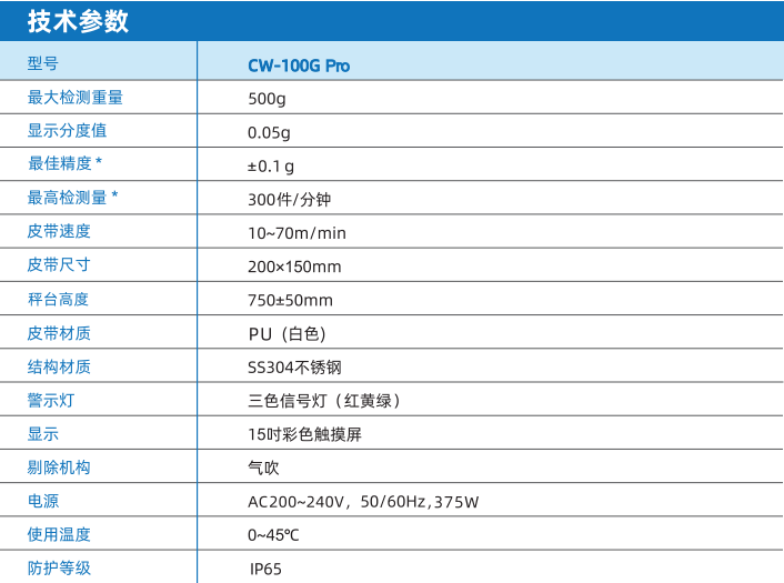 CW-100g Pro是一款穩(wěn)定可靠、高精度高速度的重量檢測機, 適用于檢重500g以內(nèi)的小型零部件及包裝產(chǎn)品(盒裝、瓶裝、袋裝等),廣泛應(yīng)用于化工、食品、五金、醫(yī)藥等行業(yè)。
