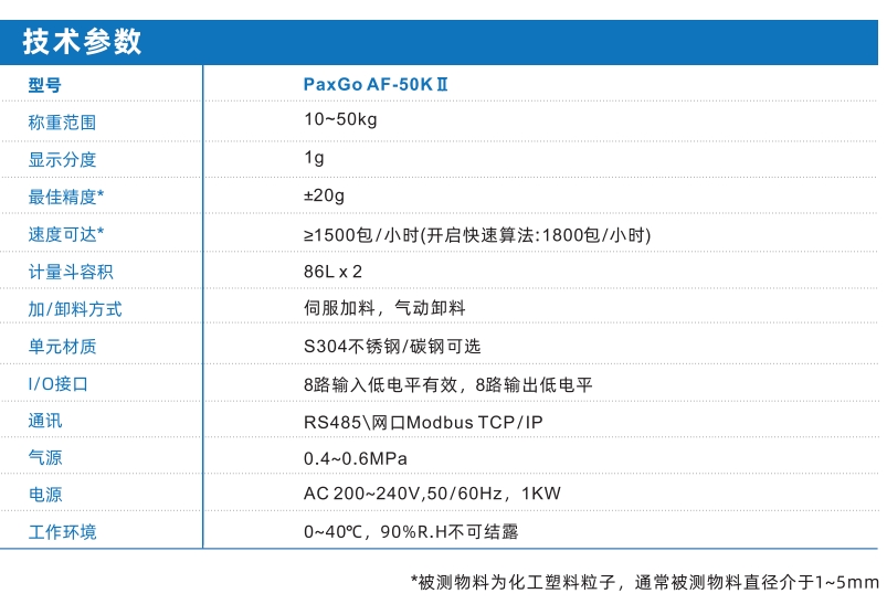 精準(zhǔn)稱(chēng)重: 高速度寬量程,適用于10~50kg的包裝,開(kāi)啟快速算法: 1800包/小時(shí),最佳精度±20g。