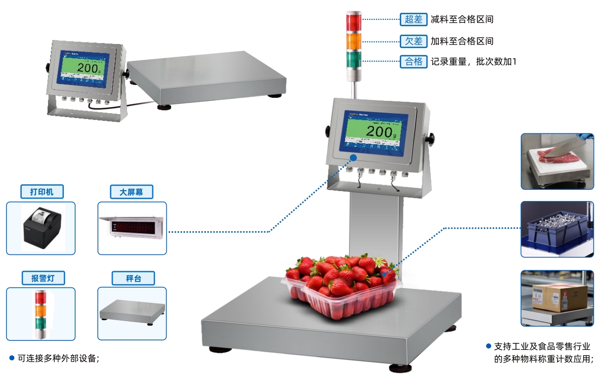 ● 外部設(shè)備連接:支持連接打印機(jī)、大屏幕顯示、三色報警燈及秤臺等設(shè)備;